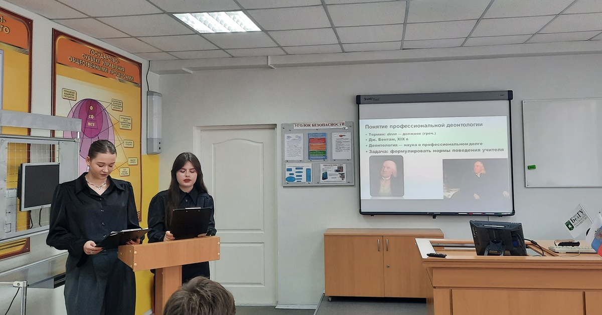 Такт - 3. О педагогической деонтологии и ее регламентах рассказали Е. Таранова и М. Устинова. Самовоспитание и селф-менеджмент - возможность компетентно проявить свой имидж и даже харизму. Кто будет наблюдать, фильтровать, контролировать действия детей??? Убеждены: аспекты выполнения своих обязанностей нынешних студентов - показатели исполнительности учителя в будущем. Даже в сложное послевоенное время студенты Старооскольского педагогического института учились, чтобы стать докторами наук, «Заслуженными учителями» и уважаемыми гражданами. Преподаватели сами учатся всю жизнь, часть наших ППС со студенческих лет были победителями Всесоюзных конкурсов, шестеро стали «Учителями года» и даже вошли в ЮНЕСКО (подразделение FIEP), получили награду за популяризацию российской науки. Чем сложнее условия, тем выше успех!