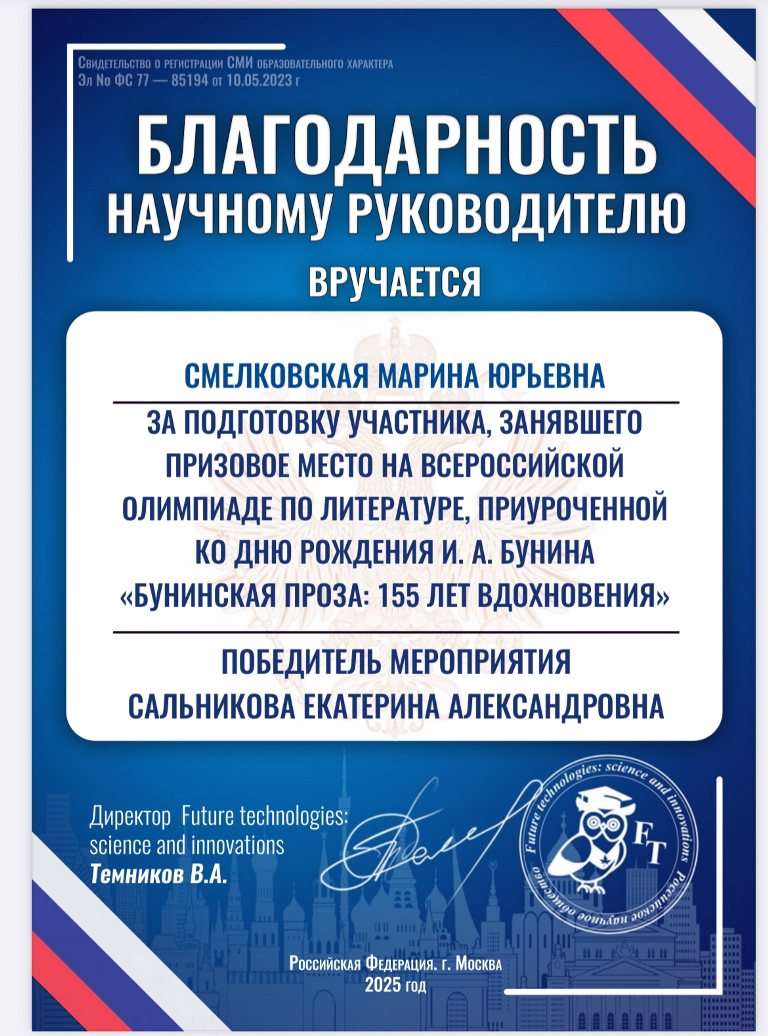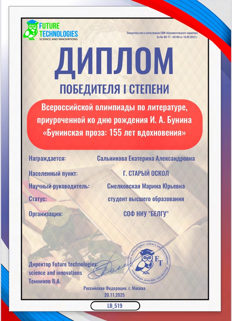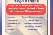 Студентка педагогического факультета СОФ НИУ «БелГУ» Екатерина Сальникова (научный руководитель — Смелковская М.Ю.) – абсолютный победитель Всероссийской олимпиады по литературе, приуроченной ко дню рождения И.А. Бунина «Бунинская проза: 155 лет вдохновения»