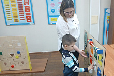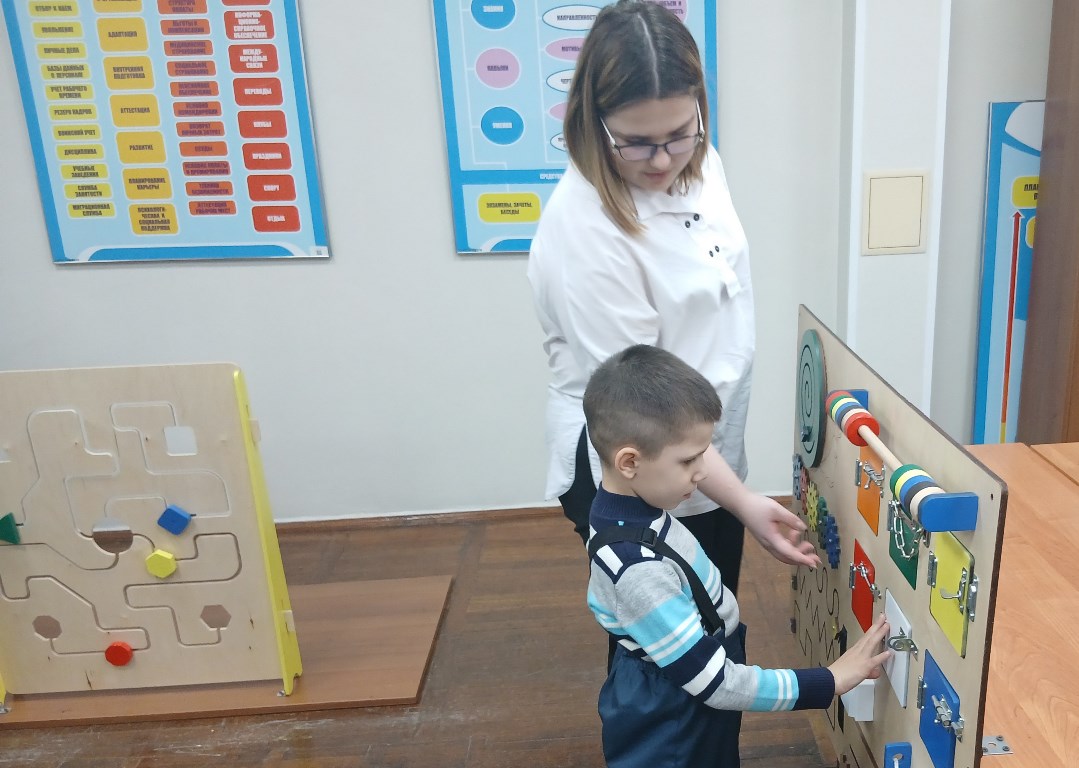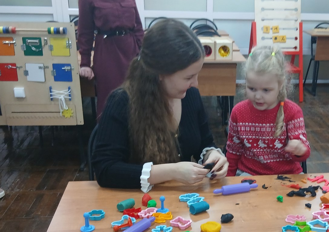 Пока взрослые на площадке «Стрессу нет!» обсуждали общие для всех семей вопросы, дети находились под опекой студентов волонтеров-тьюторов. Будущие учителя начальных классов уверенно занимаются со своими подопечными: лепят из мягкого теста, строят замки из кинетического песка, развивая мелкую моторику, умело работают с развивающими панелями и стендами.